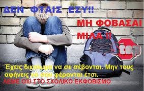 O εκφοβισμός ή bullying είναι ένα σύνηθες φαινόμενο που εμφανίζεται στα σχολεία ανά τον κόσμο! Αφορά ένα φαινόμενο κατά την οποία ασκείται εσκεμμένη, απρόκλητη και συστηματική βία και επιθετική συμπεριφοράς με στόχο τον ψυχολογικό και σωματικό πόνο σε μαθητές από συμμαθητές τους.